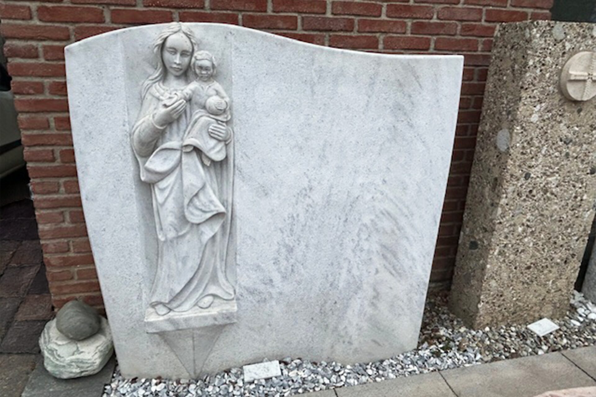 Grabstein aus Astir Marmor (Griechenland), fein gestockt und überschliffen mit Bildhauerarbeit (Madonna mit Kind)