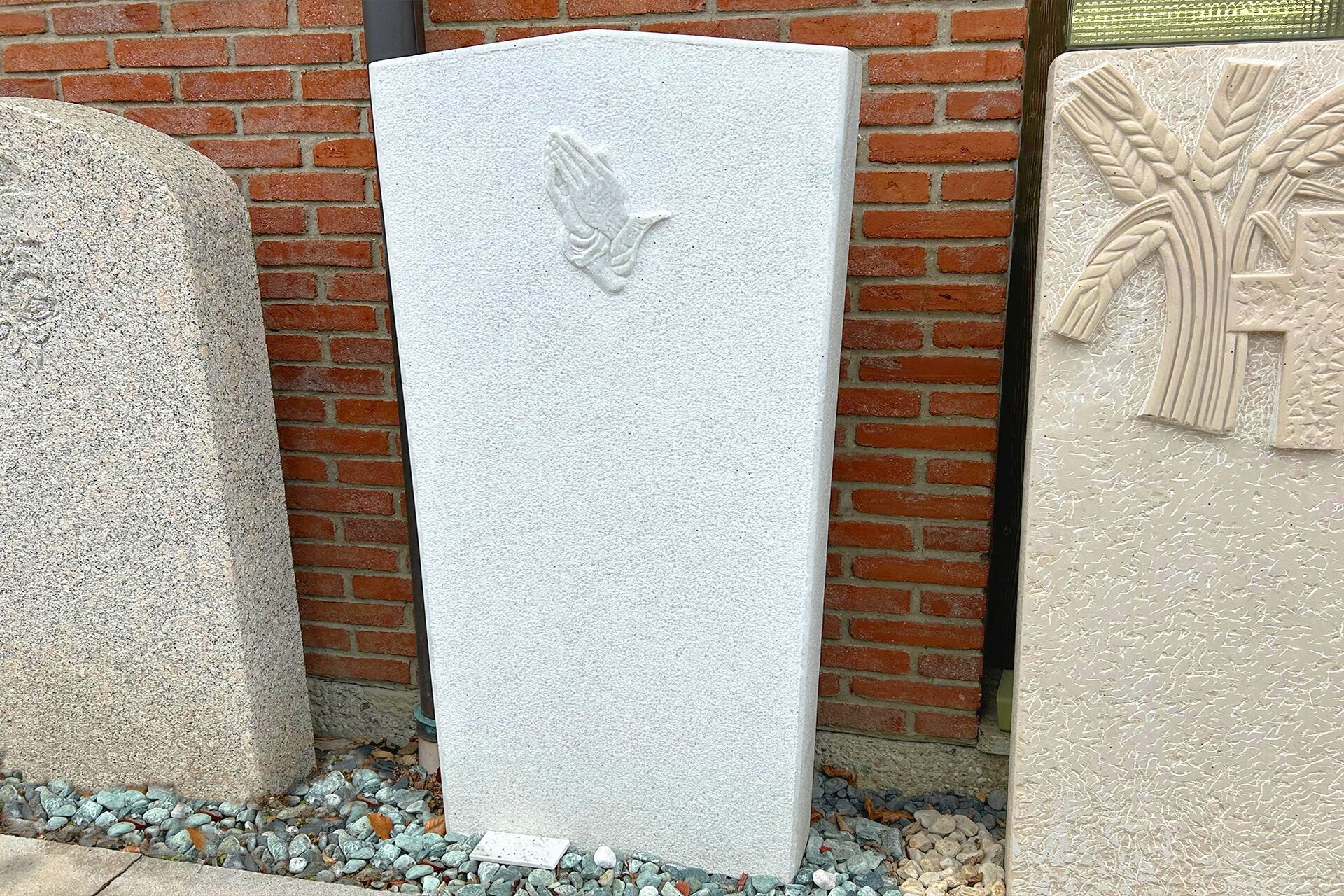 Grabstein aus Astir Marmor (Griechenland), allseits fein gestockt, mit Motiv "betende Hände"