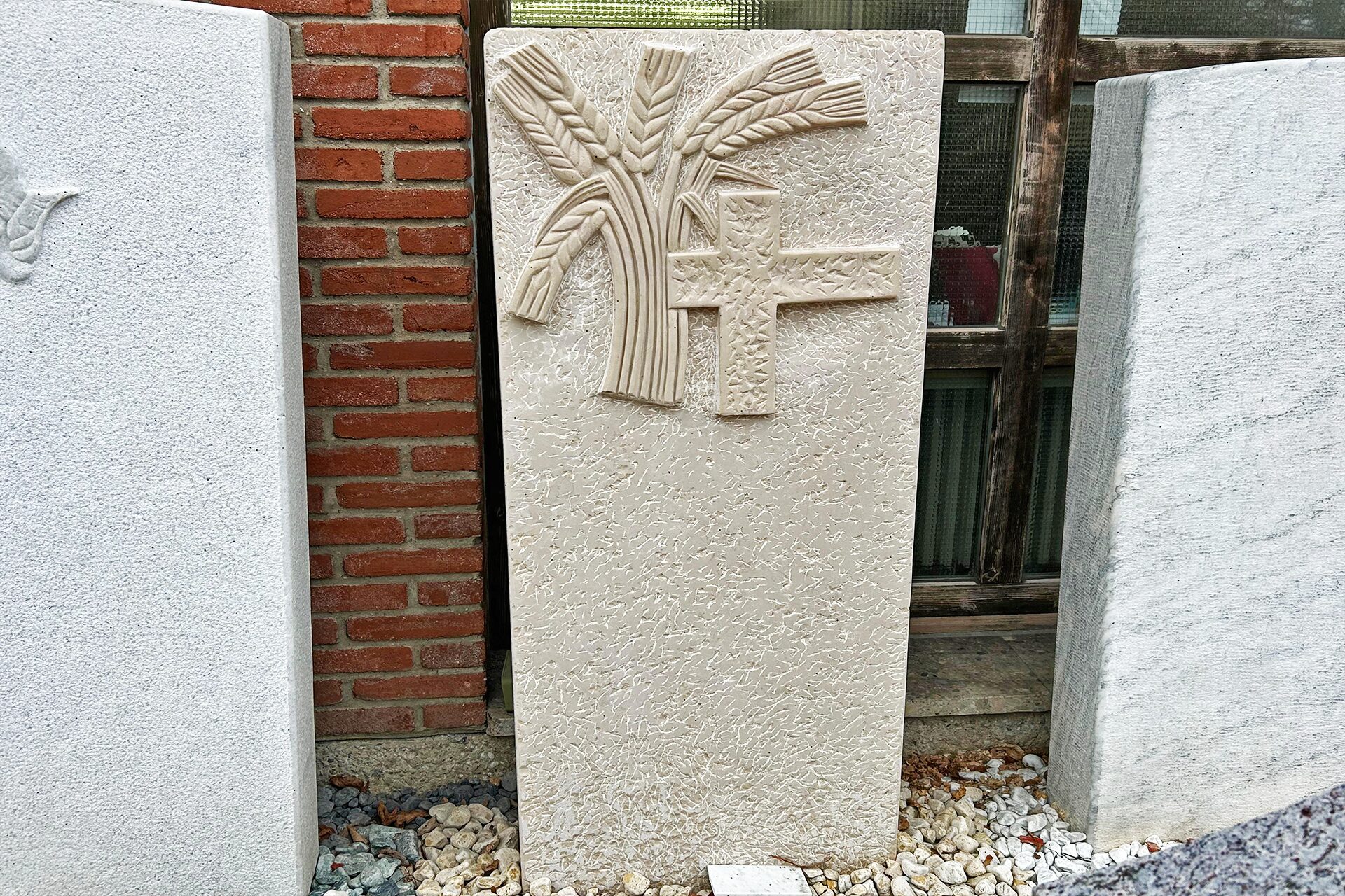 Grabstein aus Trani Kalkstein (Italien), allseits gespitzt und angeschliffen, mit Ähren und Kreuz